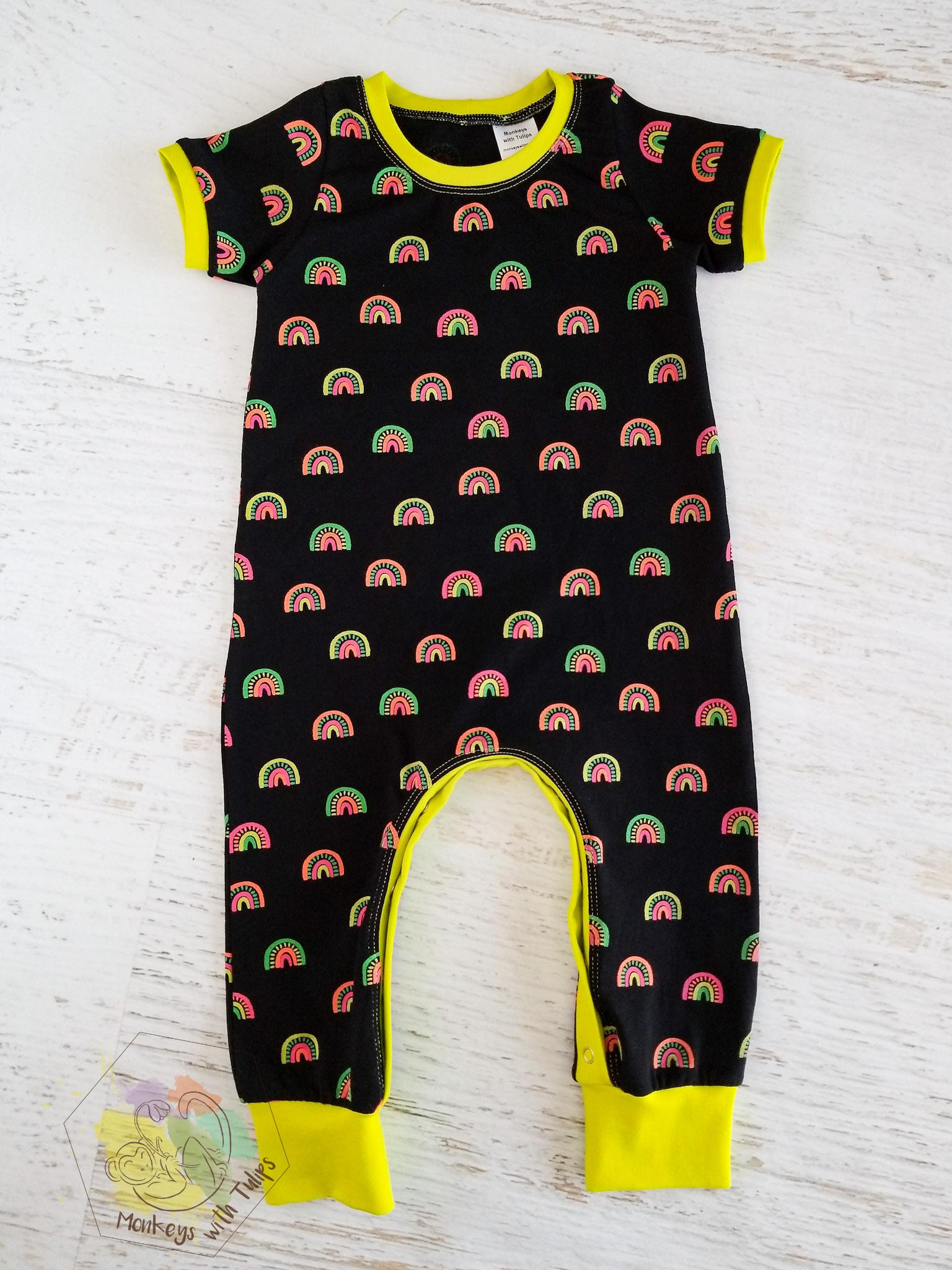 Super soft lightweight cotton spandex - black with neon rainbows! This has funky chartreuse accents. Inseam snaps for easy changes.