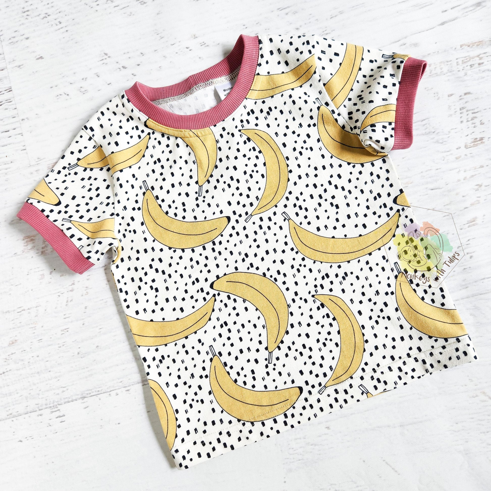 Fun banana print on lightweight cotton spandex. The ringer tee is a looser, casual fit.