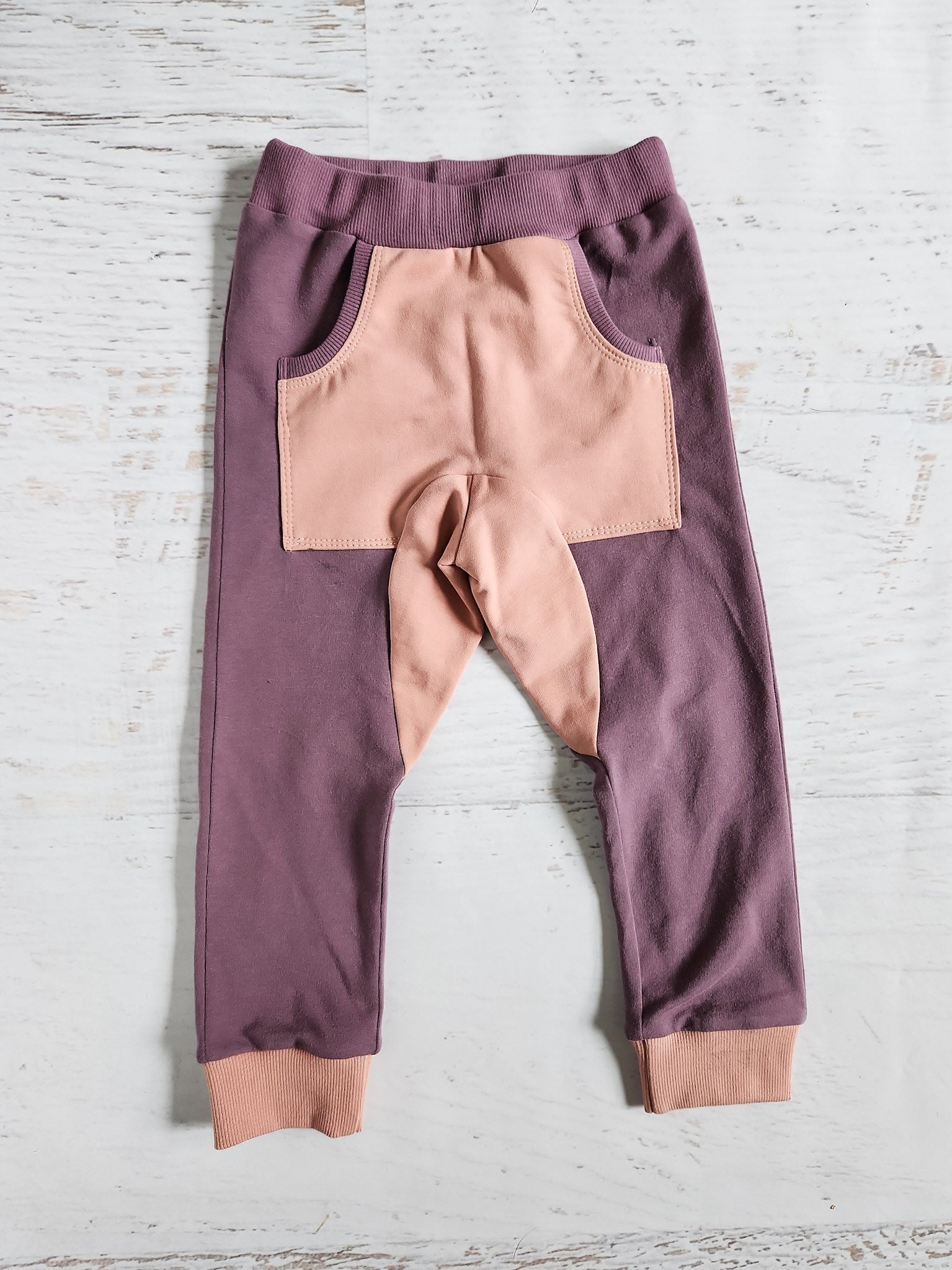 Elderberry French terry paired with mauve accents. These joggers have an enclosed elasticized waist, front kangaroo pocket and a large gusset for great range of motion. 2/3t fits a kiddo with a 20.5" waist and who is 38.5" tall. All cotton spandex.