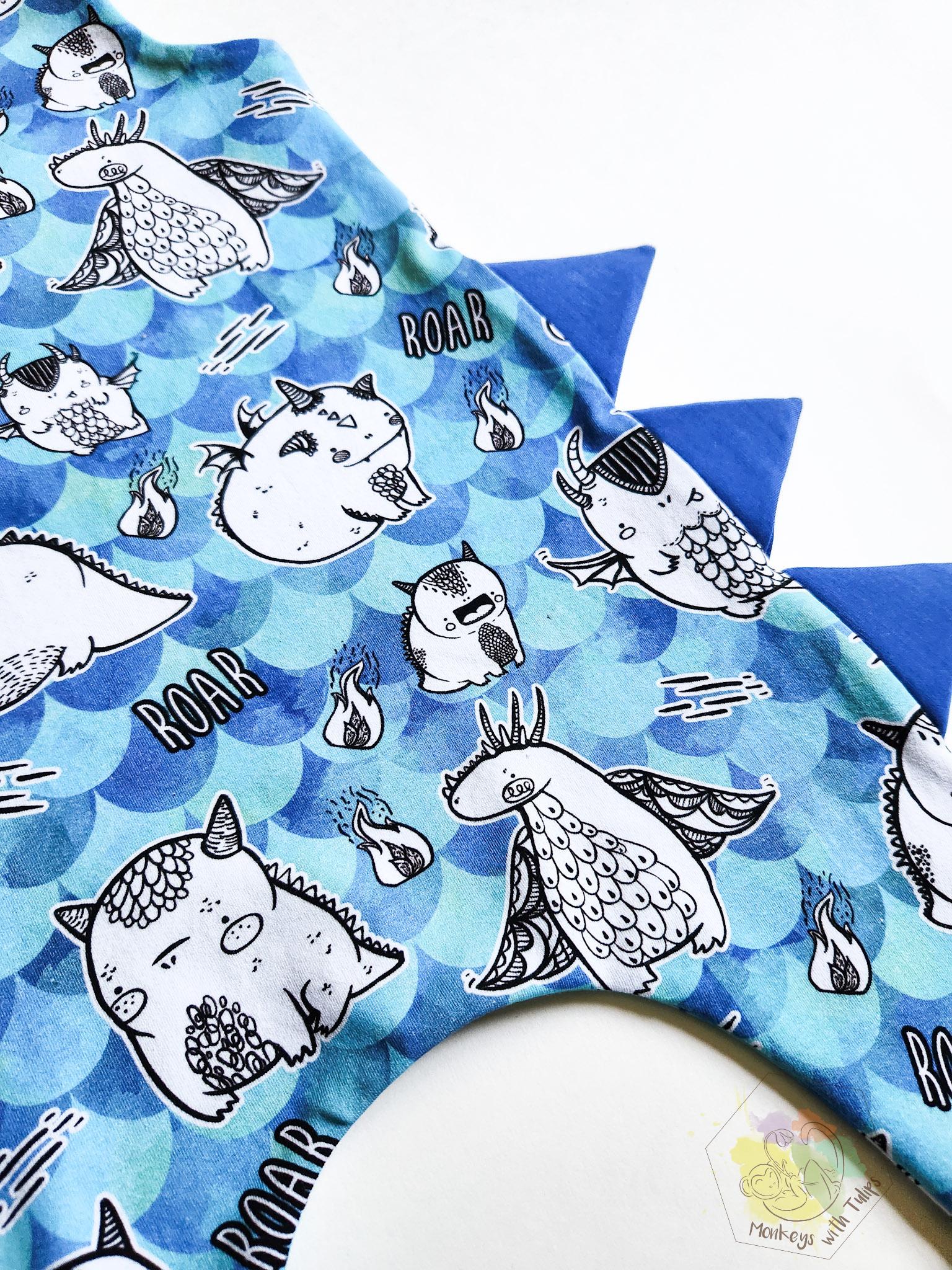 Roar! Super sweet romper for even the smallest dragon lover. These rompers are roomy and comfortable. They look great layered over a bodysuit or tee or just on their own. Metal snaps at shoulders.