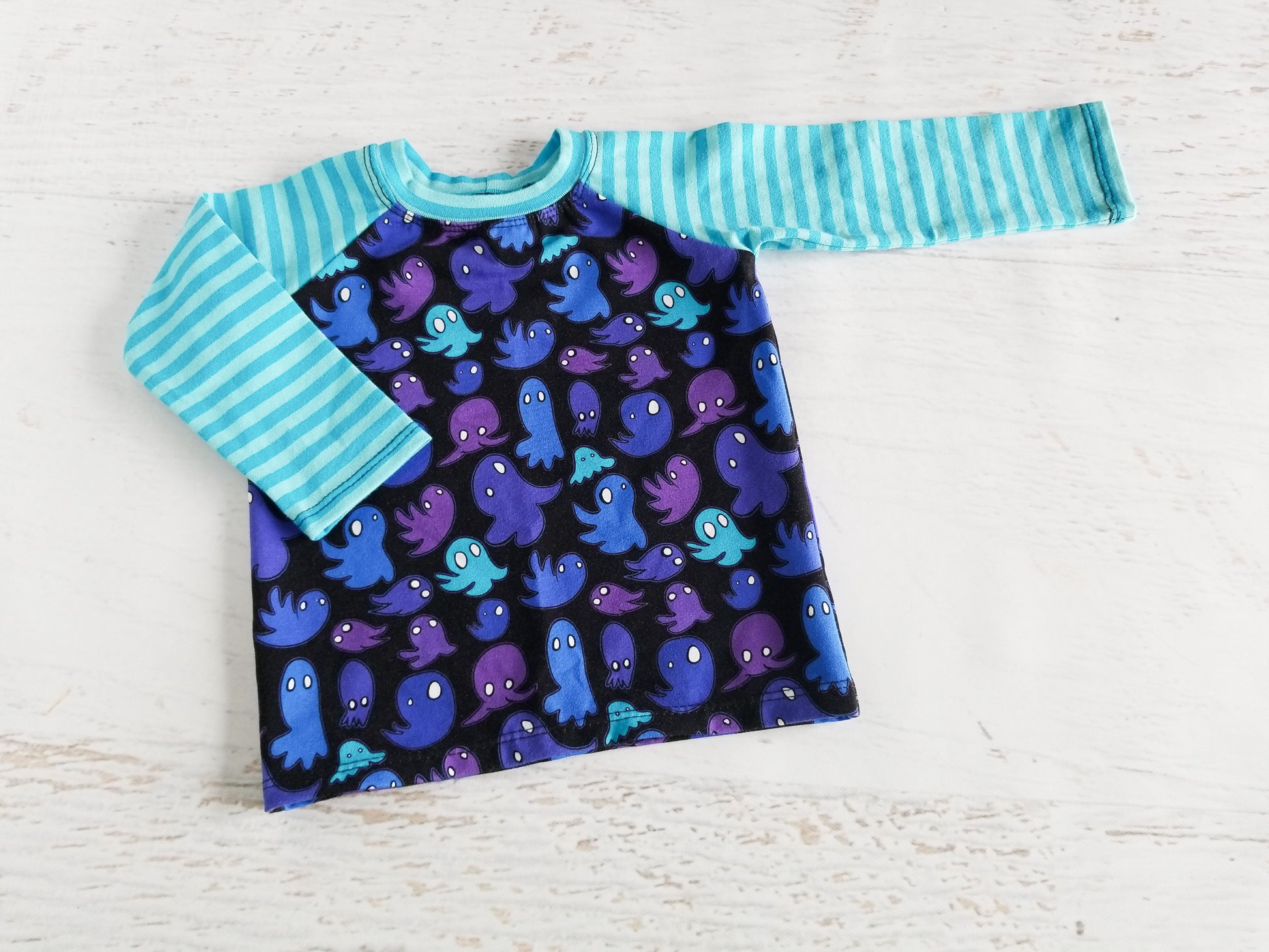 Cute baby sized tee for Halloween or all year! The soft cotton lycra fabric is stretchy and gently for baby's skin. Blue and purple ghosts on black are the front and back with coordinating tonal blue stripes.