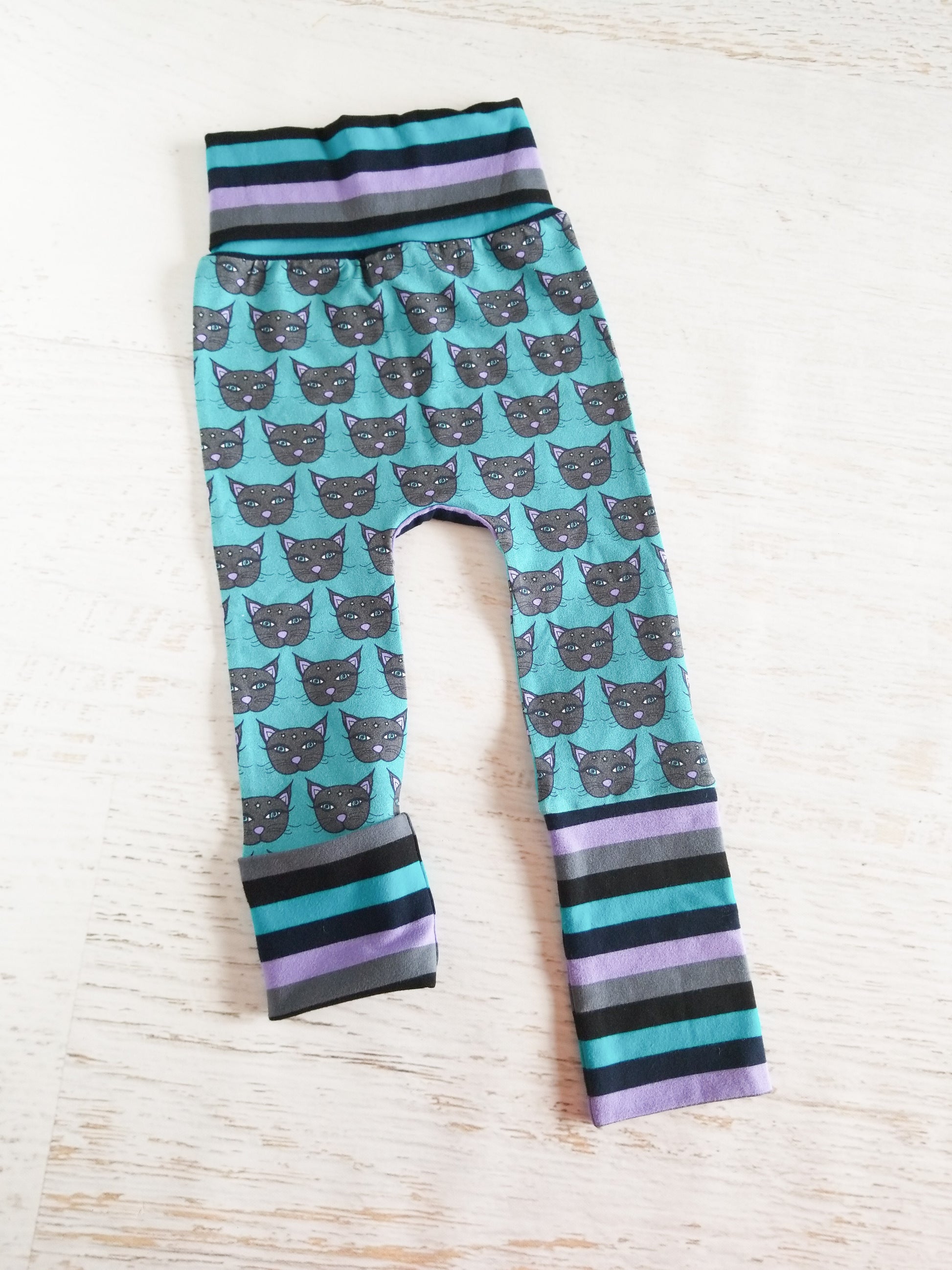 Who doesn't want cat pants? These will stick around awhile - lasting from about 1 -3 yrs. Fold the waist and ankle cuffs to adjust the size for kiddo. They are made from soft, stretchy cotton lycra and have a cute bum circle for a little extra booty room.