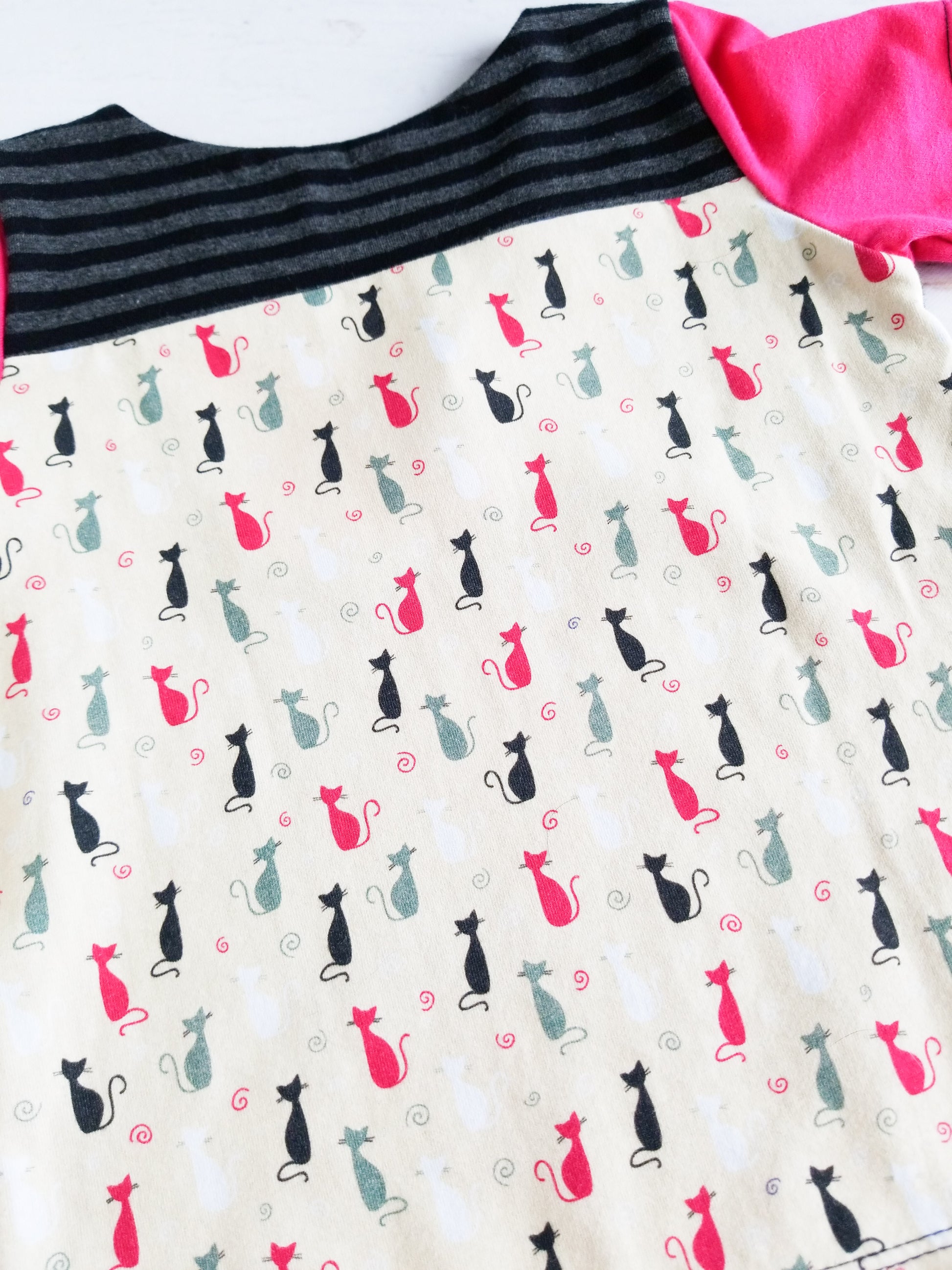 One of a kind tee - striped front, kitties back and hot pink accents! Snap front bib detail functions, otherwise I've found the neck is roomy enough to slip on and off without unsnapping. Size 18 month.