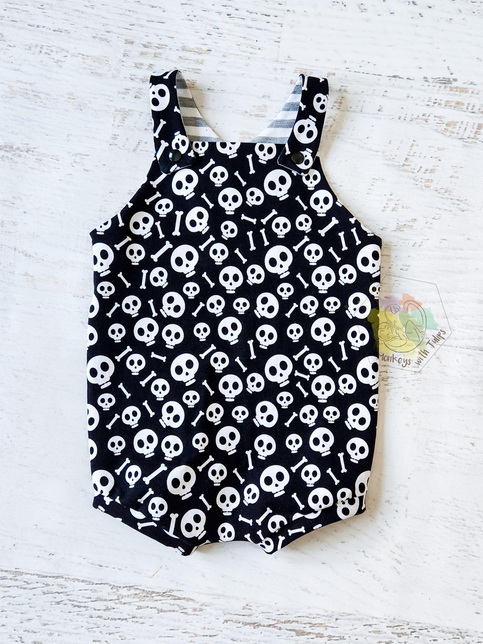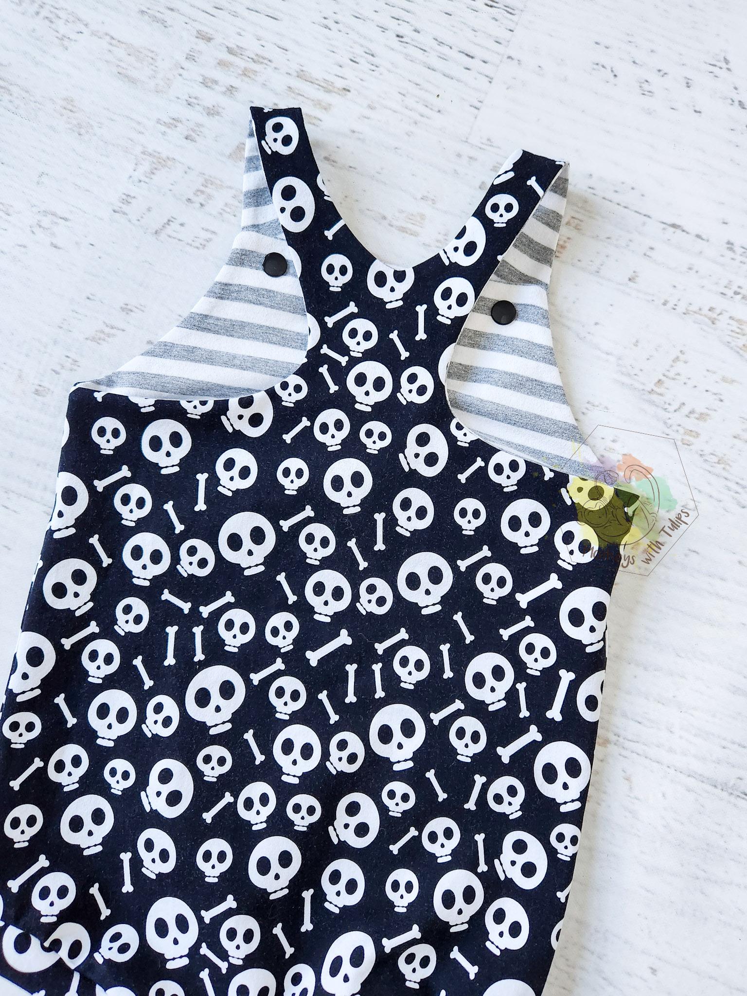 Comfy romper in a fun skull print! Racer back, lined top and snap straps. Made of soft cotton Lycra.