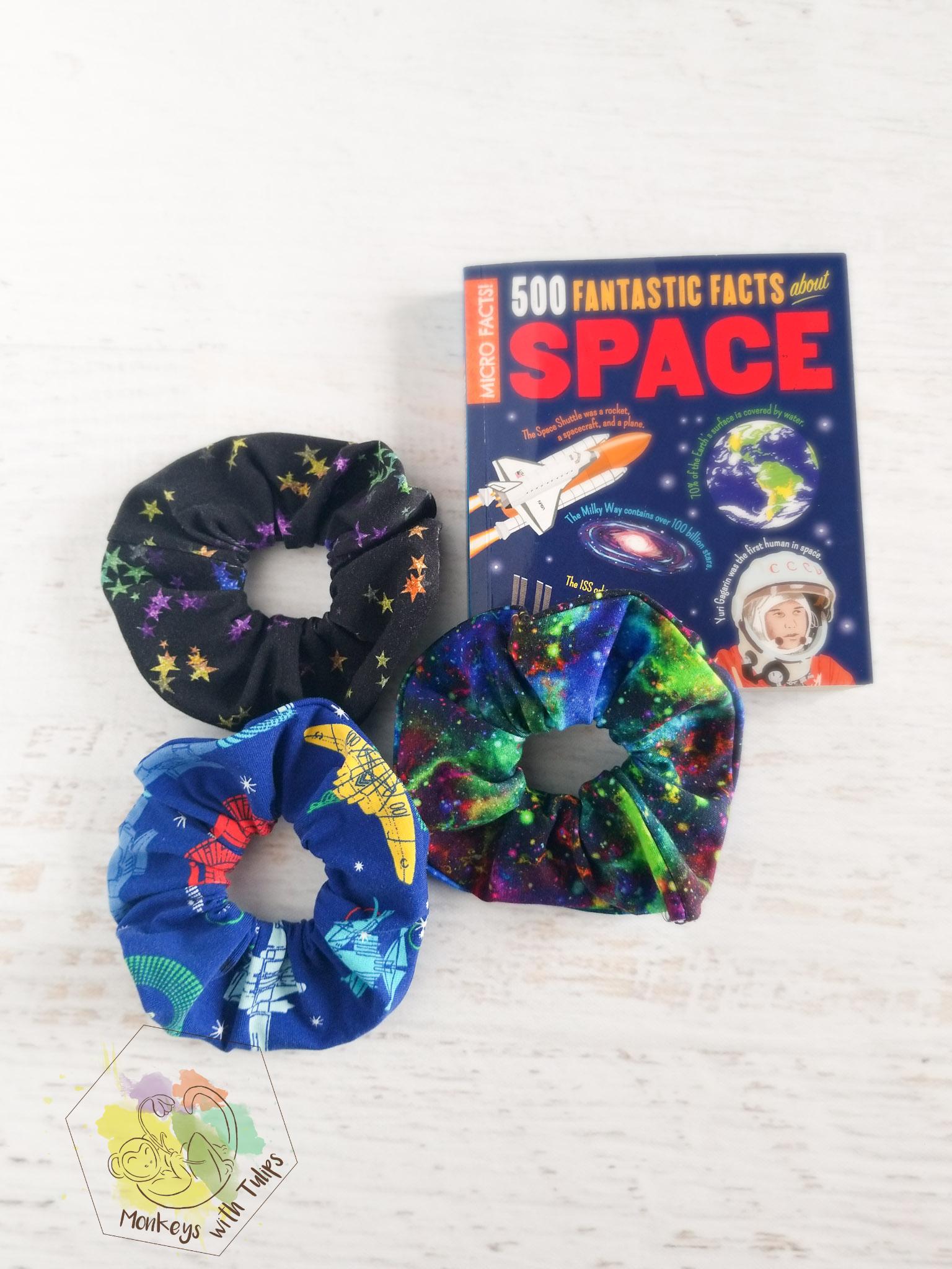 Cotton lycra scrunchies in super fun space themed prints! These are a small or child sized scrunchie. Made with completely enclosed elastic.