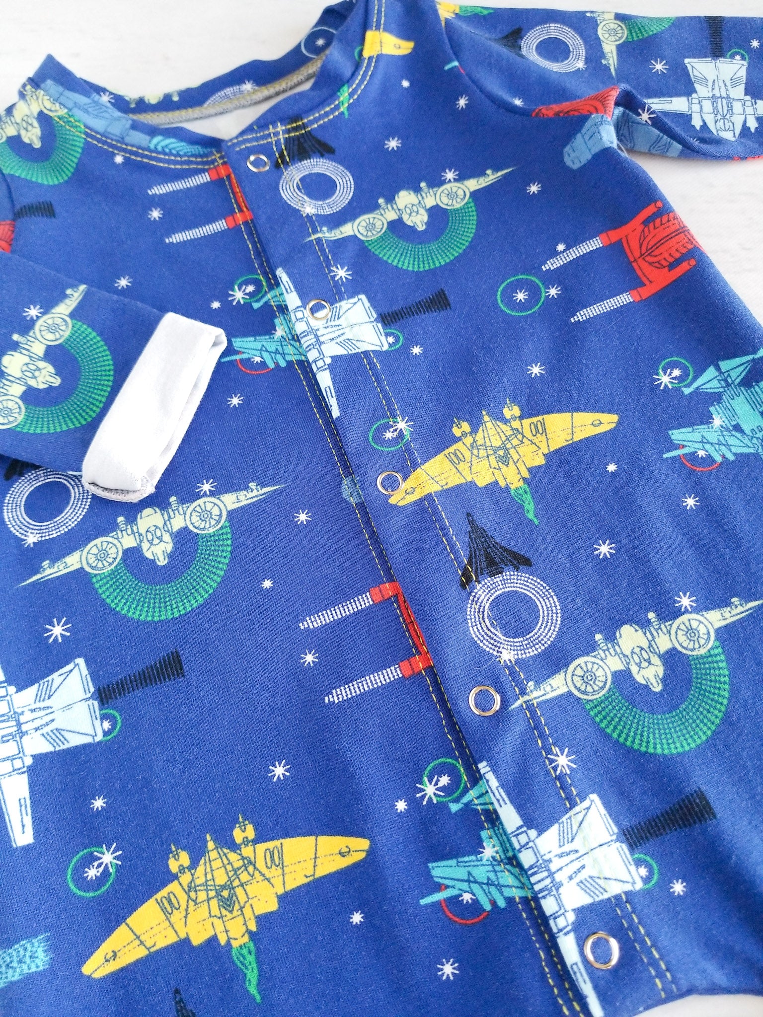 This rolled hem romper is a comfy one piece outfit for baby. Soft cotton lycra and a loose fit style. It has metal snaps down the front for in and out. This style does fit a bit big.