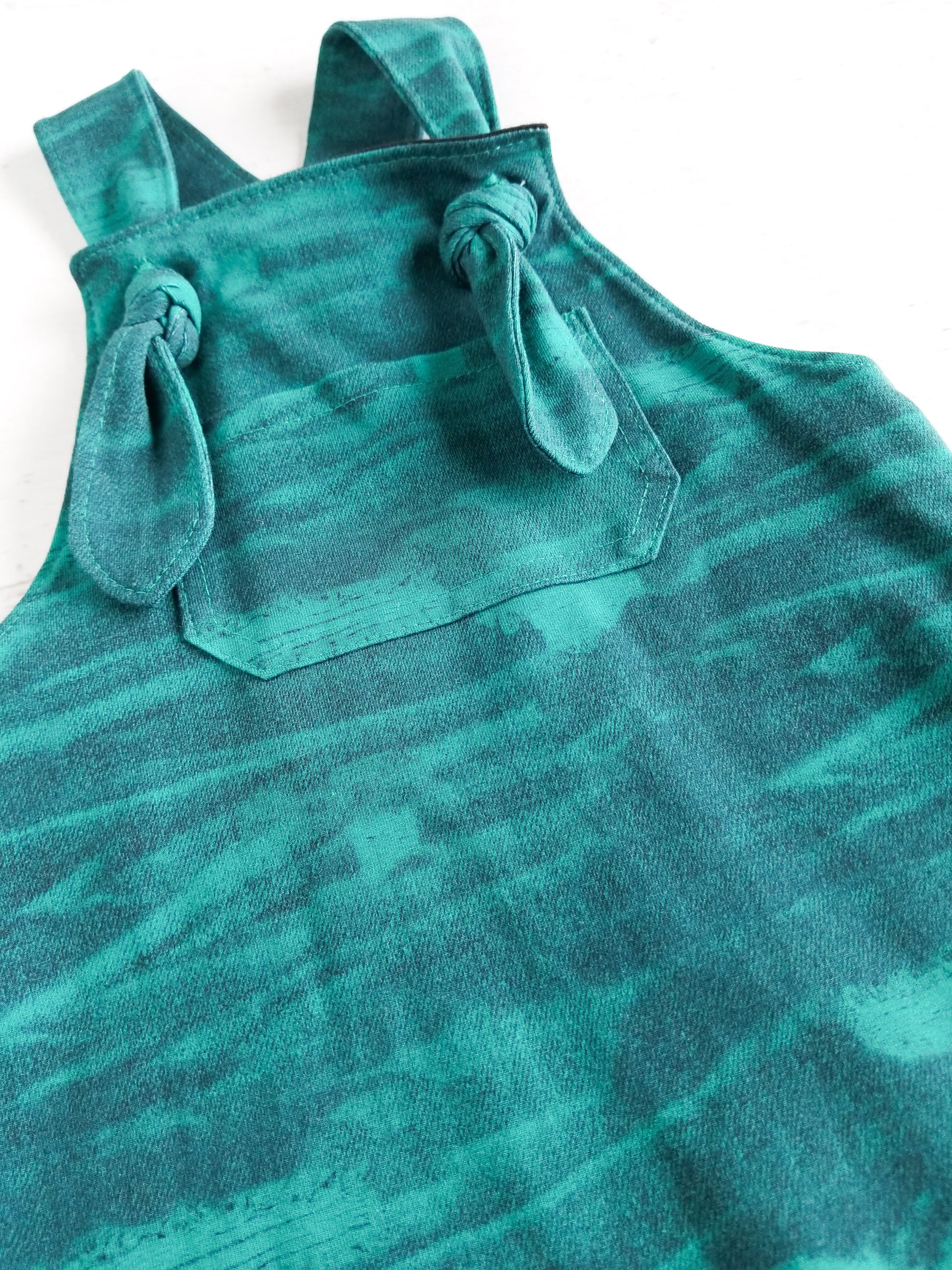 This was a sample - the first thing sewed up with a new pattern, plus I made changes, like made the knotted straps, lengthened the inseam just a bit and made an inside out/rolled up hem. These were worn ONCE for [indoor] pictures, over underthings on a clean toddler.