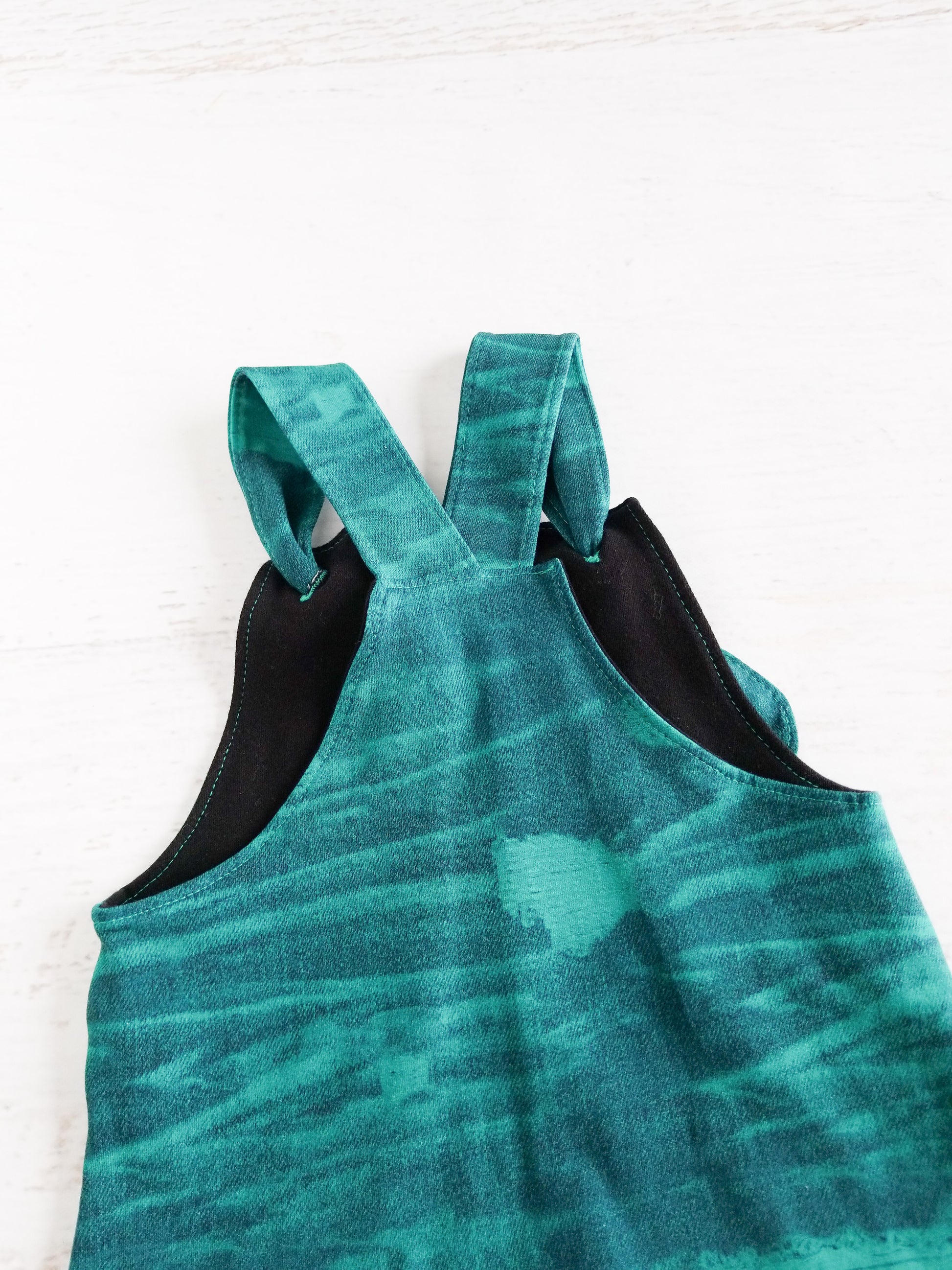 Teal faux distressed short overall romper, 2t, **SECONDS**