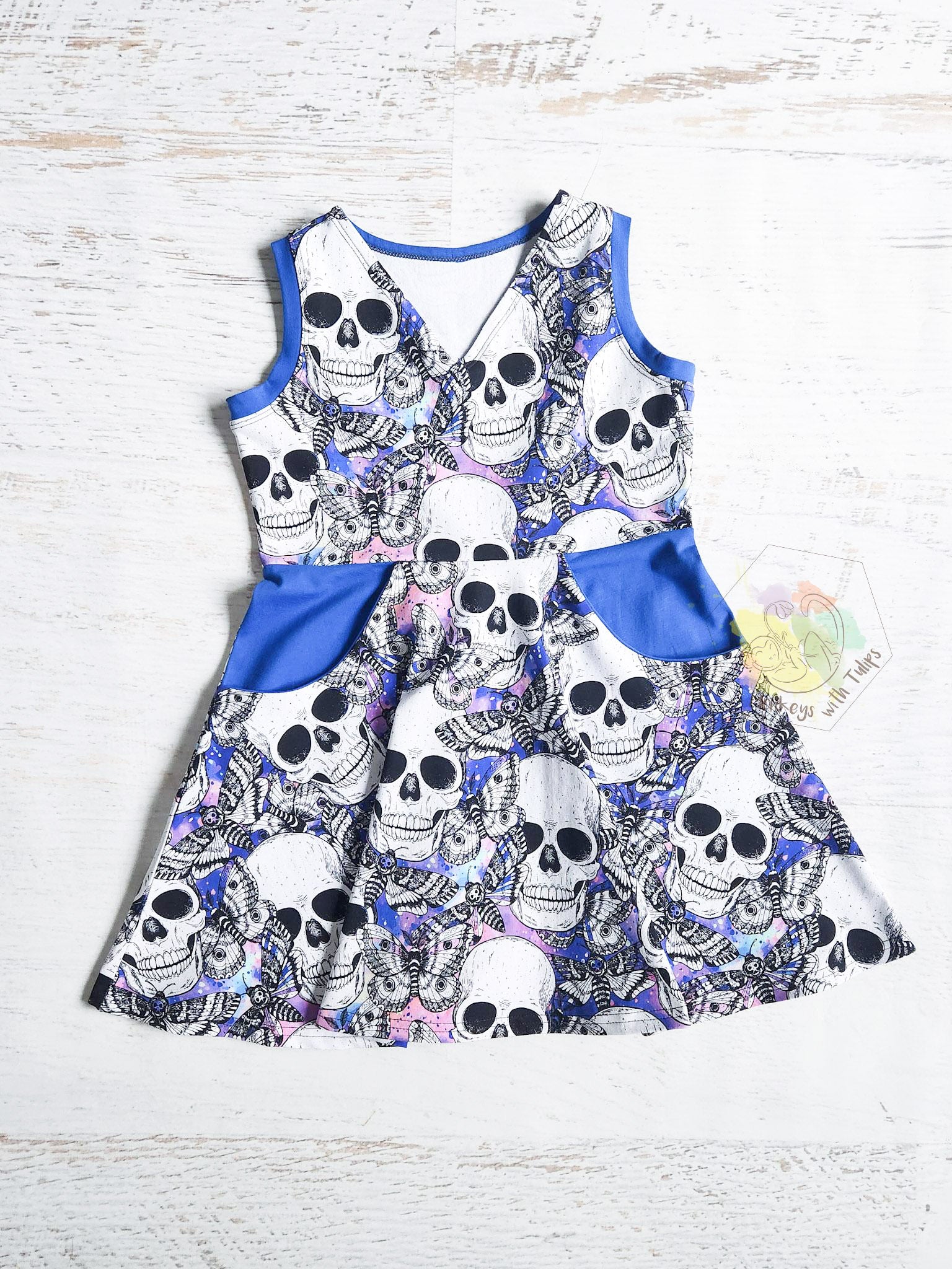 Slightly twirly dress with deep pockets! Casual/slightly relaxed fit with a vintage length skirt (hitting right above the knee) Gorgeous print with skulls and death head moths completed by the sweet pink/purple/blue watercolor background. Soft, high quality cotton Lycra.