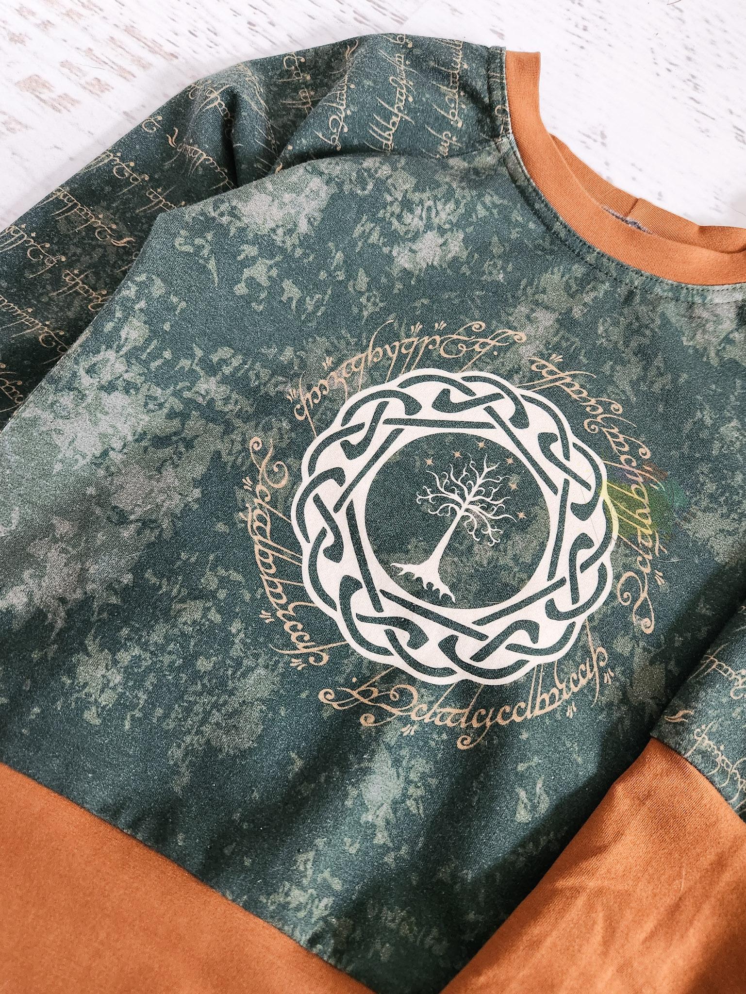 If you hate when baby grows out of their clothes so fast, this style is for you! With wrist cuffs and a waistband that can be folded to adjust size from 18 month to 4 yrs. Beautifully designed panel of the White Tree on the front with an Elven script print for the sleeves and back.