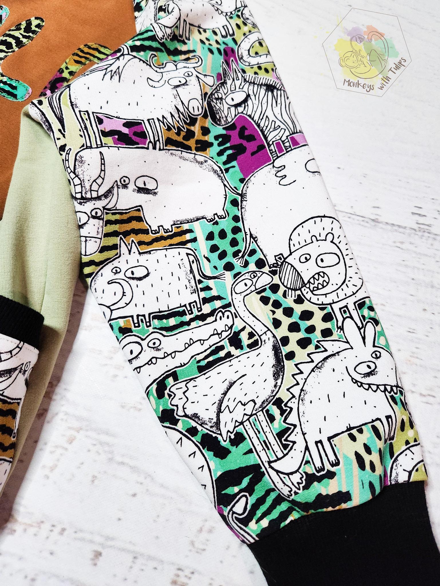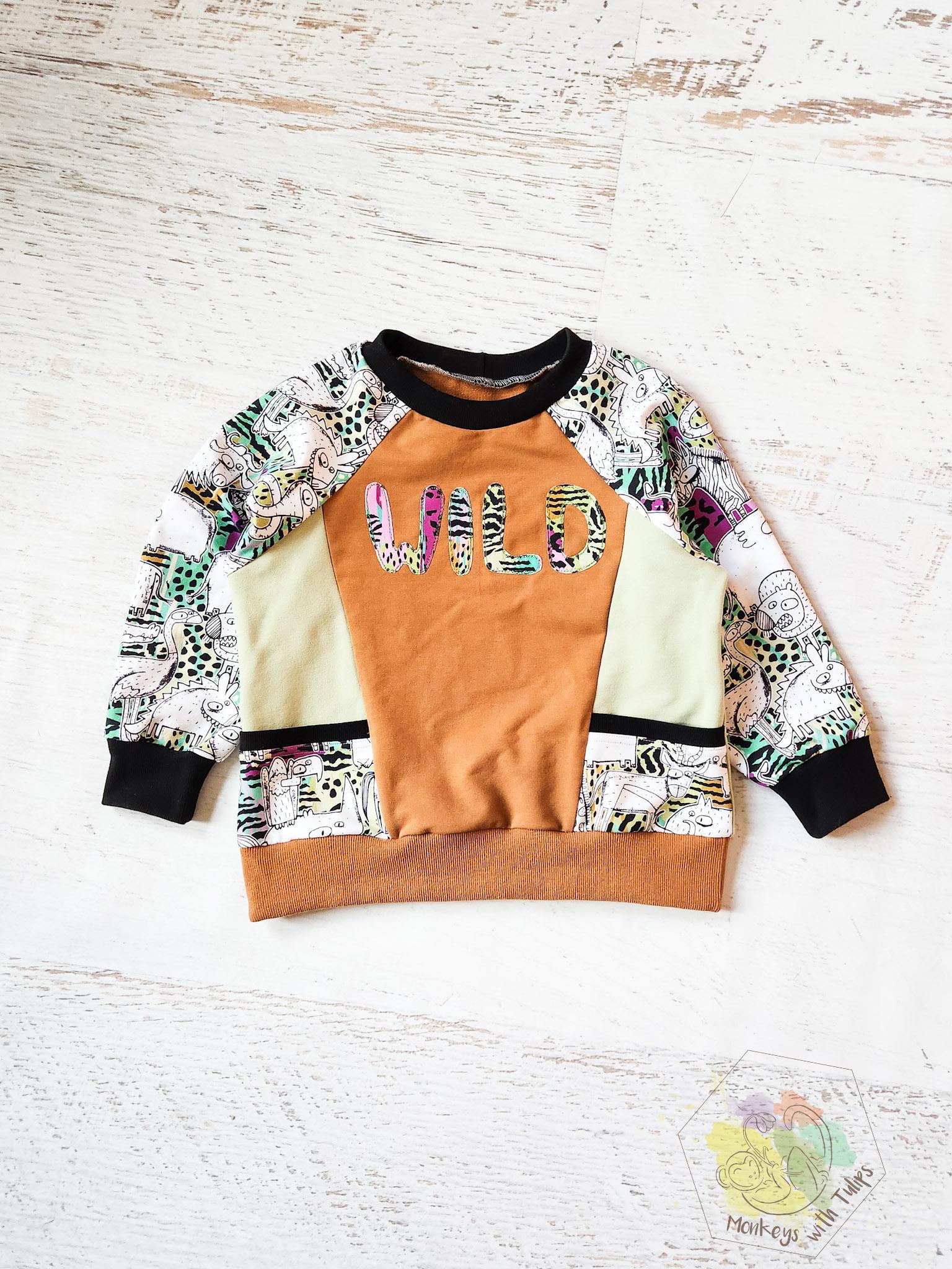 This cozy pullover is made of heavy cotton Lycra French terry. With an oversized fit and fun colorblocking it's sure to be a hit! Front applique and pockets.